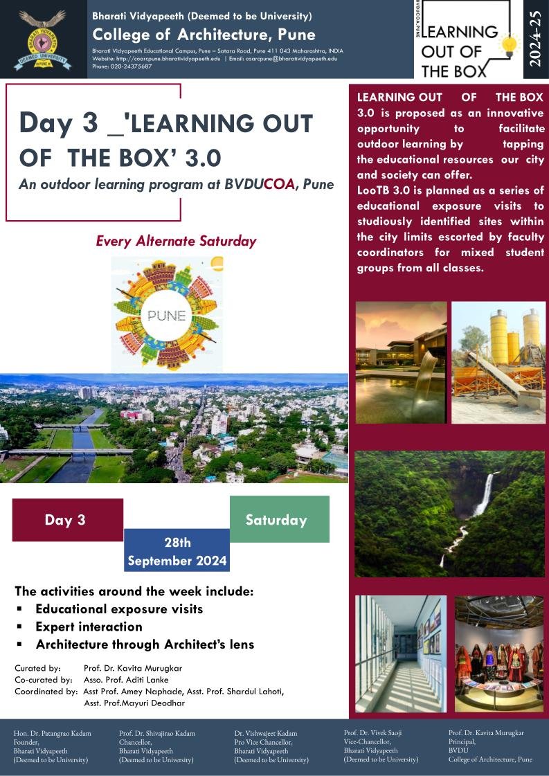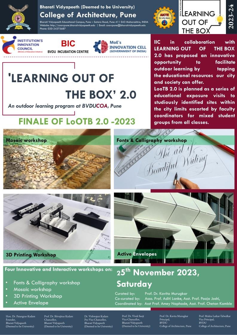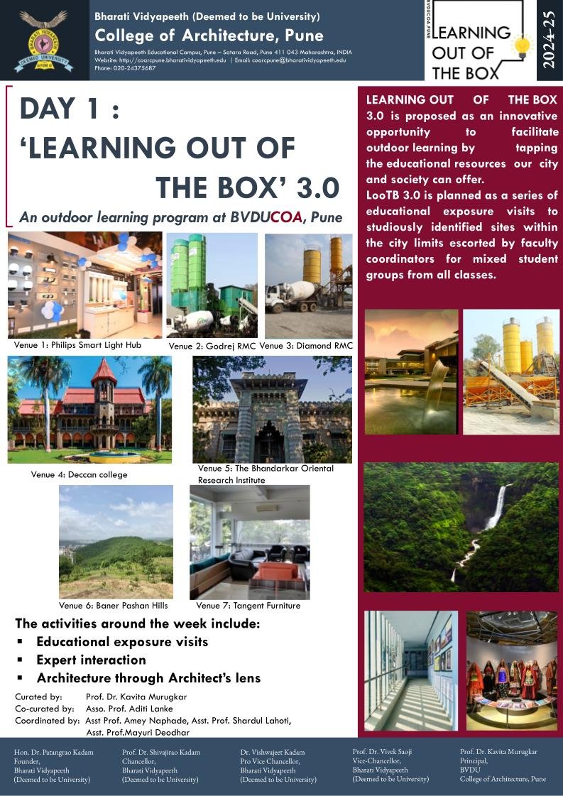 "Learning Out of The Box" (LOotB) is an innovative outdoor learning program that embraces both multidisciplinary and interdisciplinary approaches as a series of educational exposure visits to studiously identified sites within the city limits that are planned to learn more about the city’s architecture, art, heritage, technology, environment and social inclusion through experiential engagement and guided interaction with industry experts.