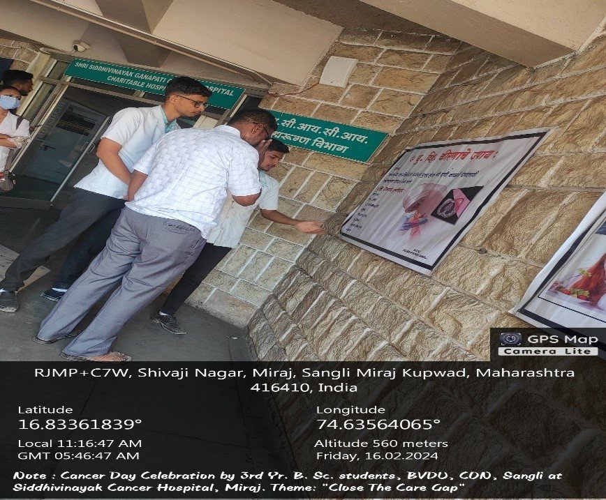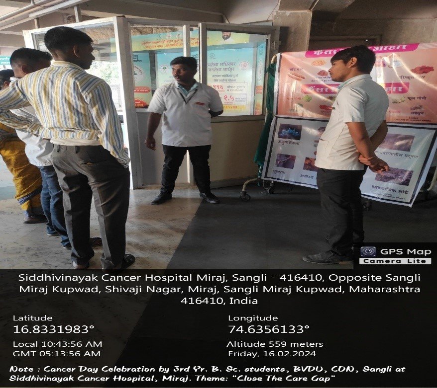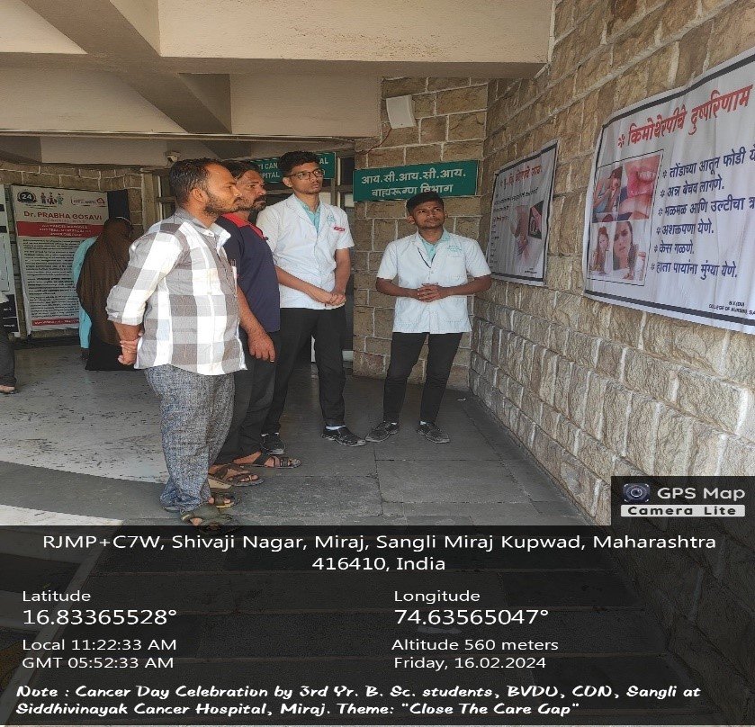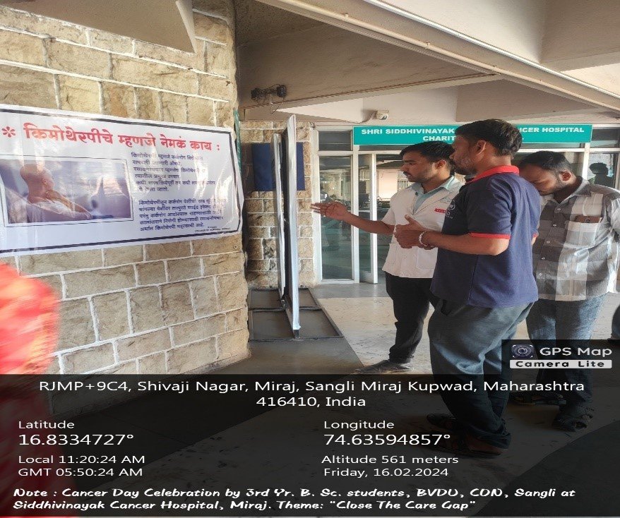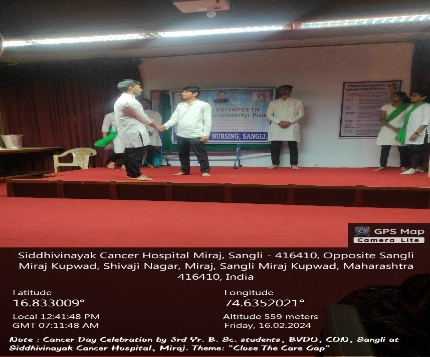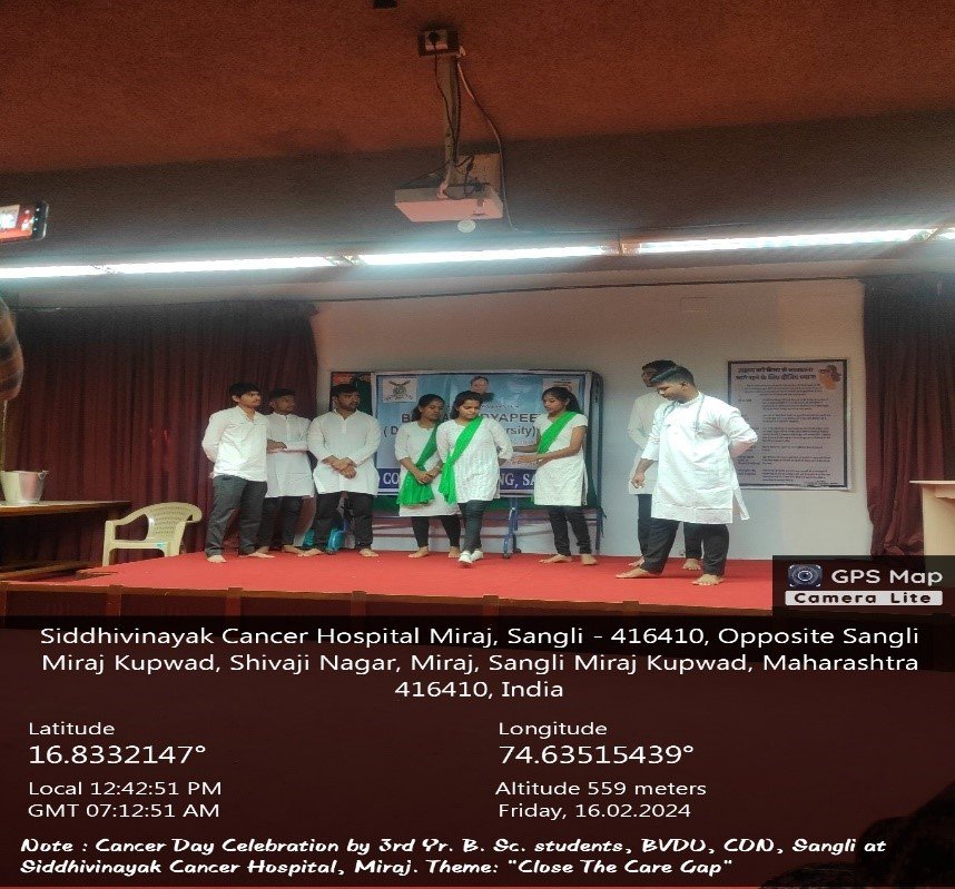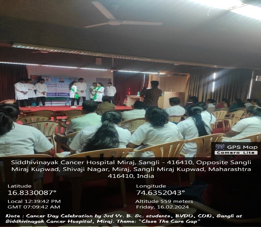 4th February is celebrated as “World Cancer Day”. Theme for the year 2024 was “CLOSE THE CARE GAP”. The 3rd Year Basic B.Sc Nursing students of Bharati Vidyapeeth (DU), College of Nursing, Sangli, celebrated World Cancer Day at Siddhivinayak Ganapati Cancer Hospital, Miraj on 16th February 2024. The students performed a role play that created awareness about cervical cancer and also informed about the HPV vaccine. Moreover, they had also displayed digital posters and explained about causes, prevention and treatment modalities of Cancer. Many were benefitted with the activity that was planned for Cancer Day celebration and the students were appreciated by the authorities of Siddhivinayak Cancer Hospital for their efforts.