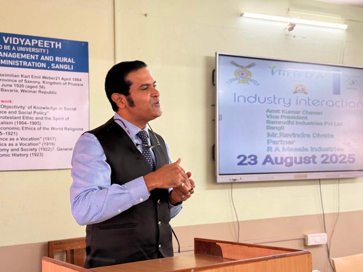 An insightful Industry Interaction Program was organized at the institute on 23rd August 2025. The session aimed at bridging the gap between academia and industry, providing students with practical insights into real-world business practices. The event featured distinguished speakers: Mr. Amit Kumar Chavan, Vice President, Samruddhi Industries Pvt. Ltd., Sangli and Mr. Ravindra Divate, Partner, R.A. Measle Industries.