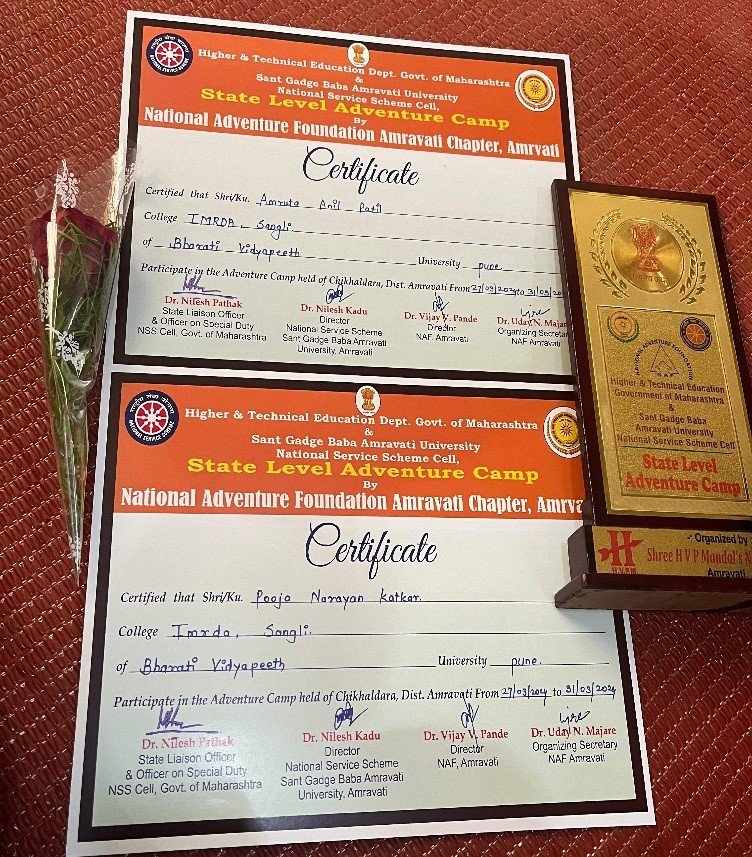 Institute’s students participated in NSS State Level Adventure Camp which was organized at Girijan Shikshan Mahavidyalaya, Yoga Kendra, Chikhaldara, District Amaravati. The camp was organized between Wednesday, 27th March 2024 t0 Sunday, 31st March 2024. The activities in the camp included climbing and rappelling, Burma bridge and parallel rope crossing, Trekking, Sky observation, Yoga and Gym activities, motivational lectures, camp fire and recreation program. 85 students from 12 universities participated in the camp. The participants were given certificates and trophy. Institute’s director Dr. Pallavi Jamsandekar, Vice Principal have appreciated the students. Institute’s NSS head Mr. Yogesh Patil guided the students.