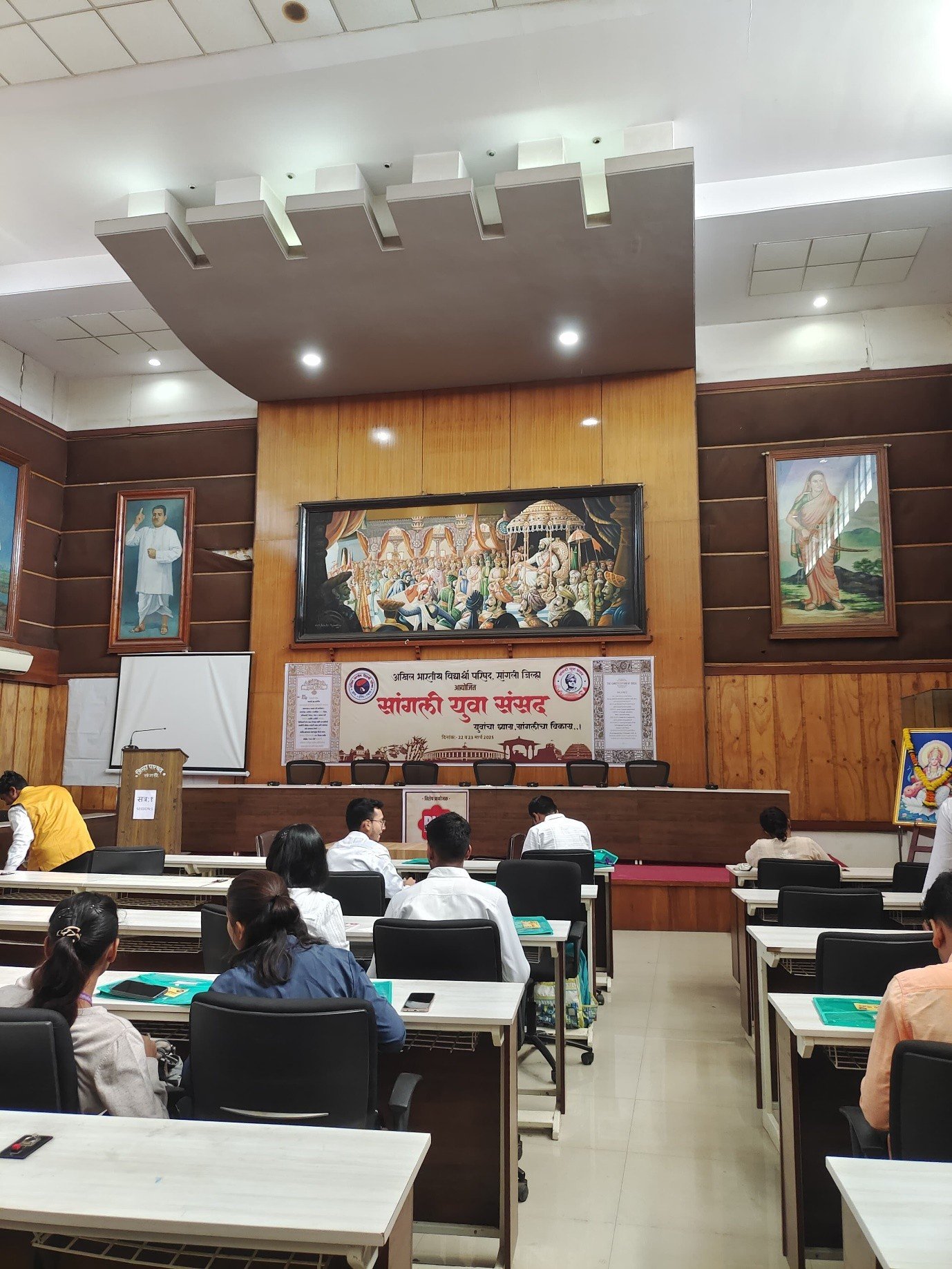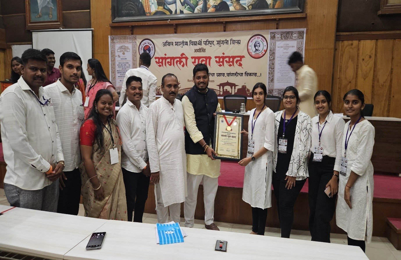 Institute’s team participated in Sangli Youth Parliament organized by Akhil Bharatiya Vidyarthi Parishad, Sangli District. The event was held on 22nd & 23rd March 2025 at Vasantdada Patil Auditorium, Zilla Parishad, Sangli. More than 100 students from various education institutes were present for the event. Teams present for the event were divided into ruling party members and opposition party members for discussing issues regarding development of Sangli. The institute team got to play opposition party members and contributed valuable insights and suggestions on the subject. Team comprised of MBA first year students Sakshi Jakhotiya, Shivam Malkar, Sumit Shah, Akansha Gaikwad and BBA second year students Pankti Gangar and Sakshi Mohite. Institute’s MBA first year student Siddhi Jakhotiya was honored with the award "Sangli Yuva Sansad Ratna" (1st Prize) for outstanding contribution on both days. She received the award at the hands of Mr. Gopichand Padalkar, Hon. member of the Legislative Assembly (MLA) Jat and in the presence of Mr. Sudhir Gadgil, Hon. member of the Legislative Assembly Sangli and Mr. Satyajit Deshmukh, Hon. member of the Legislative Assembly, Shirala.