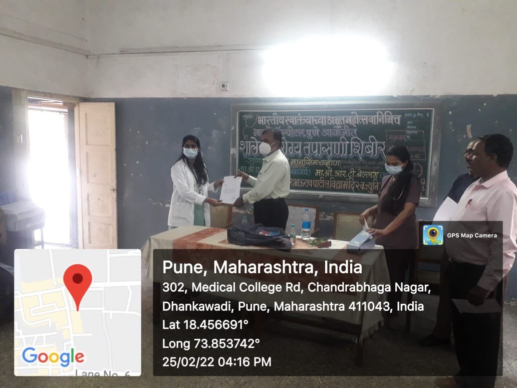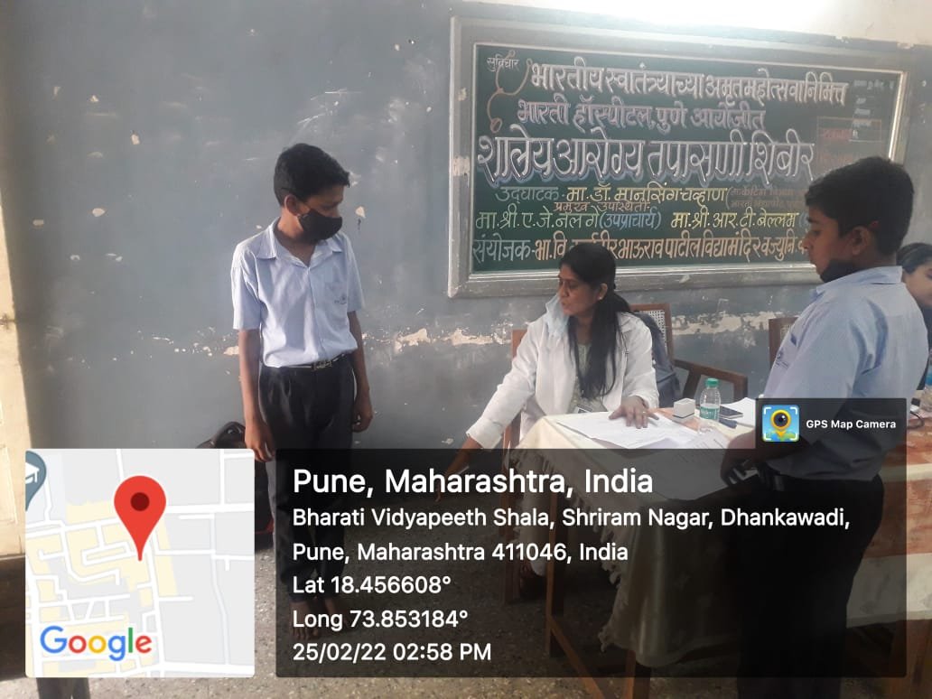 On account of Amrit Mahotsav of Independence Day of India, BVDU Karmaveer Bhaurao Patil Vidyamandir and Junior College successfully conducted a one-day free health check-up camp on 25/02/2022 in association with Bharati hospital foundation and School of Physiotherapy, Pune.