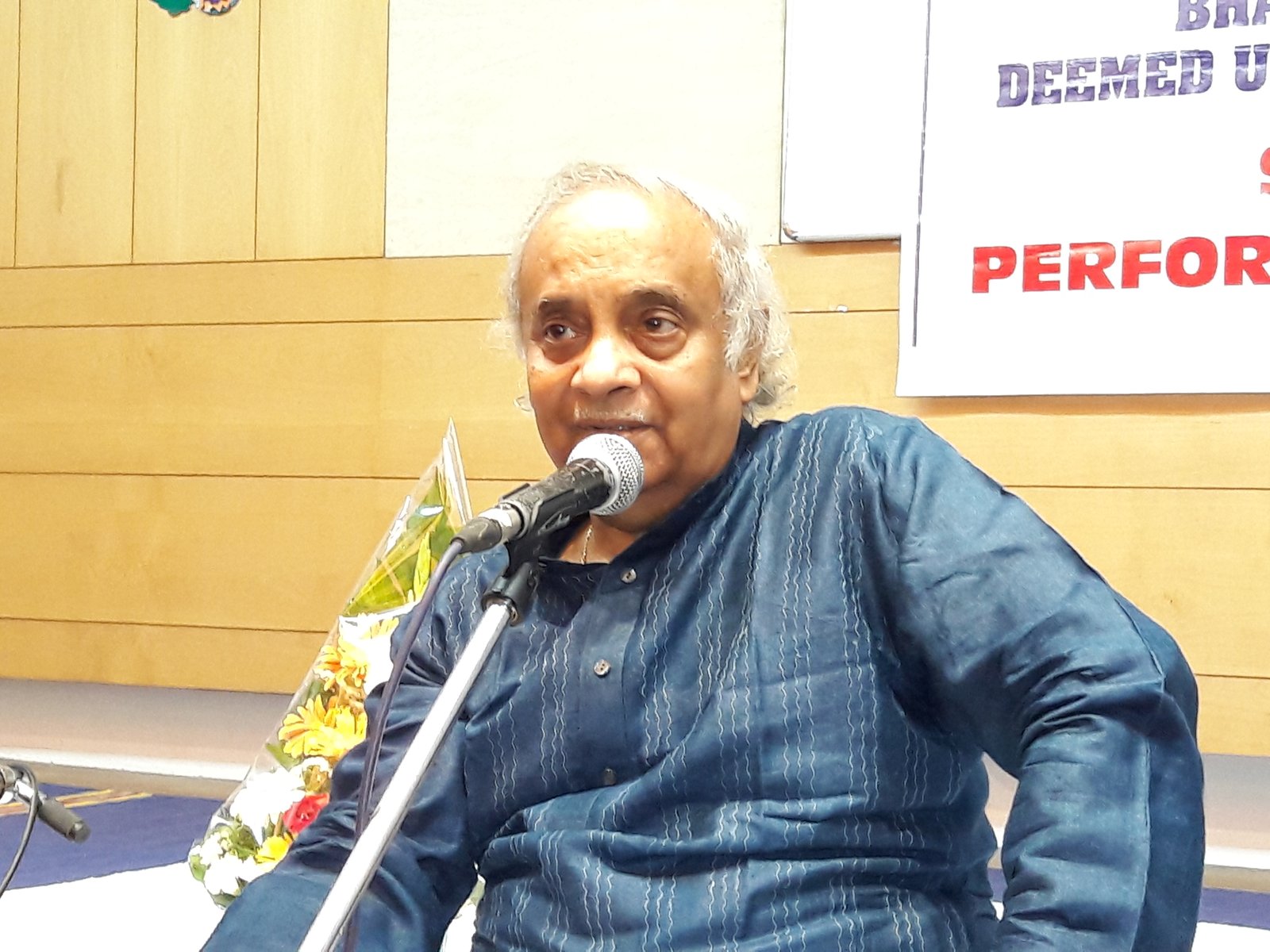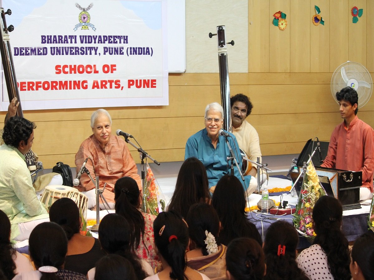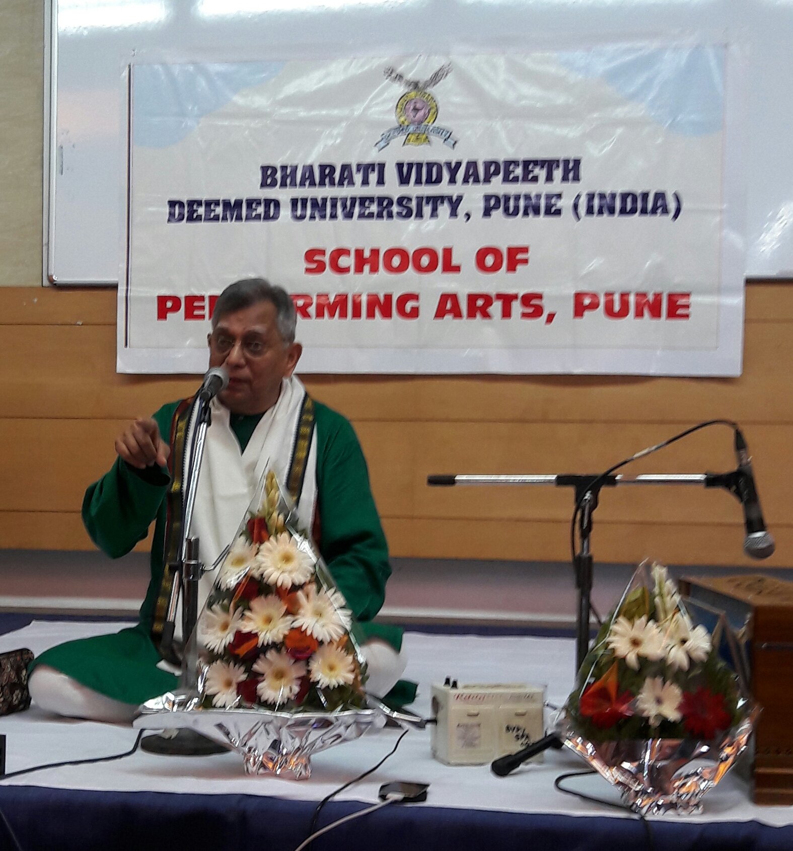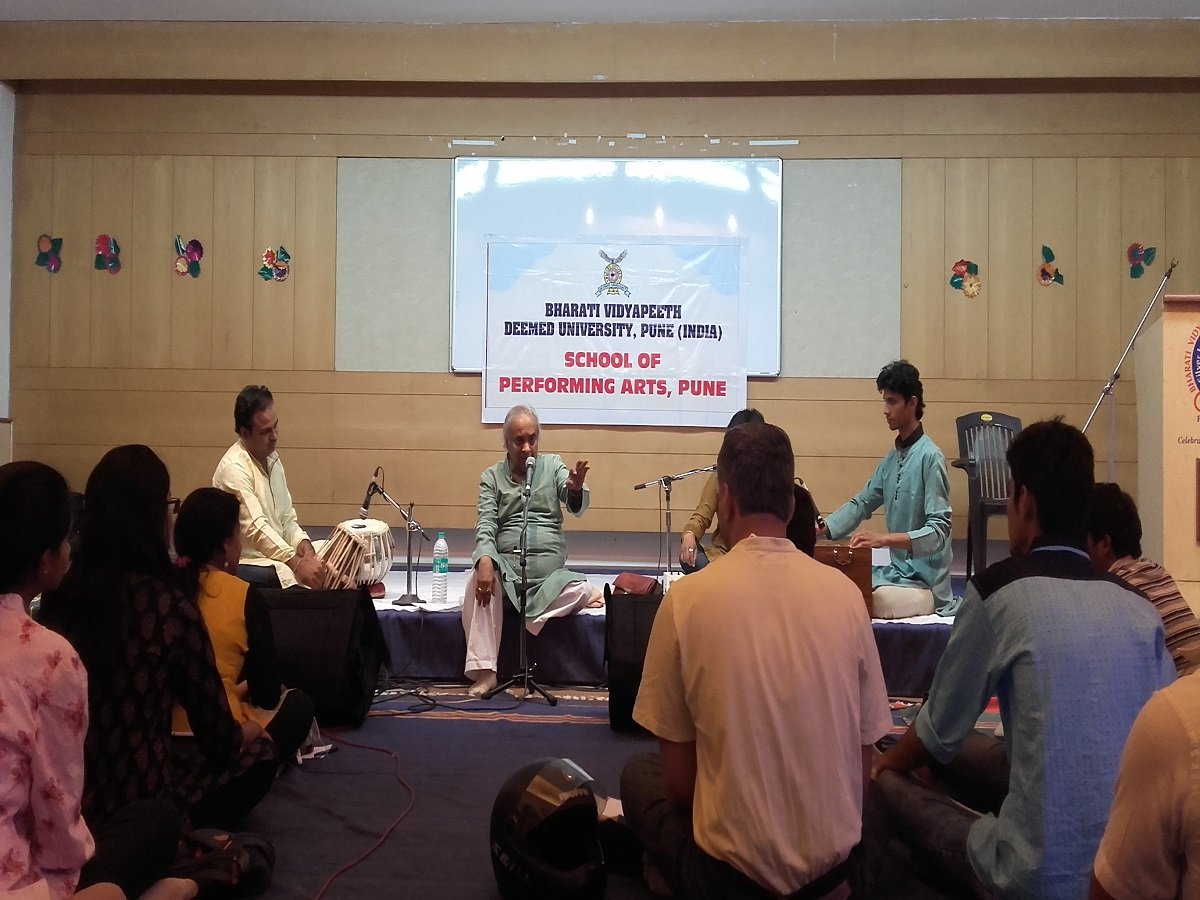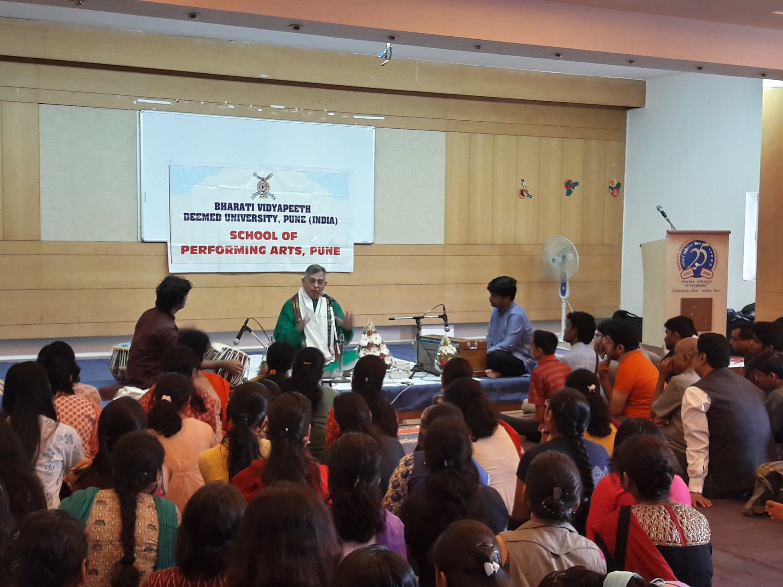 School of Performing Arts had organized workshop of Pt. Shrinivas Joshi featuring Aesthetical elements of Kirana Gharana and the Gayaki of Bharatratna Pt. Bhimsen Joshi. Pt. Shrinivas Joshi spoke on Swara Lagav, Raga elaboration technique of Kirana Gharana. He also discussed in detail about the presentation of Thumari in Kirana Gharana and other related topics. Later he talked at length about Gayaki of his father Late Pt. Bhimsen Joshi and his Riyaz techniques. Students also learned some special compositions of Kirana Gharana.