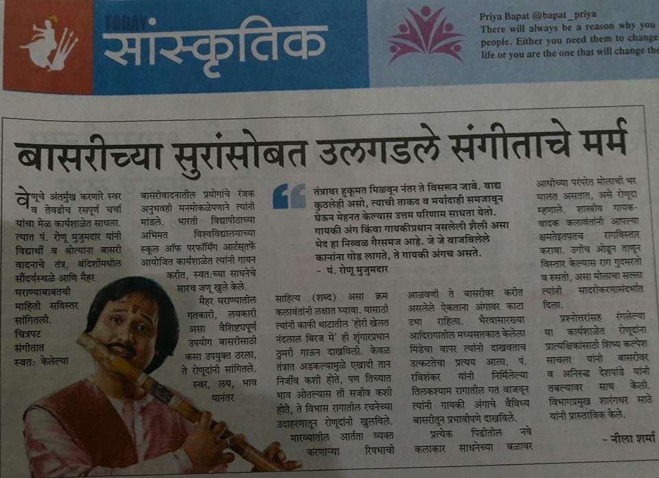 Students got a wonderful opportunity to learn about Maihar Gharana from world famous artist Pt. Ronu Majumdar in a workshop conducted by him. Ronuji also talked about the training he received under the able guidance of Pt. Ravi Shankar and Gayaki, Tantrakari style in playing flute.