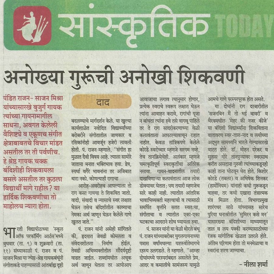 Two day workshop of Padmabhushan Pt. Rajan and Padmabhushan Pt. Sajan Mishra was conducted at School of Performing Arts. They enfolded the process of ‘Raag - Vistar’ and aesthetics of Bandish along with nuances of Semi Classical forms of Music. It was a bliss for students to learn few compositions from Legendary artistes Pt. Rajan and Pt. Sajan Mishra