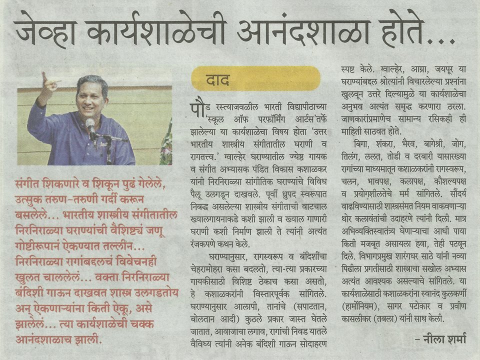 Two day workshop by Dr. Vikas Kashalkar dealt with origins of Gharana, aesthetics and special features of each Gharana. Scientific and detailed study of ‘Samprakrutik Raag’ was brought forth along with melodious presentation by Dr. Vikas Kashalkar.