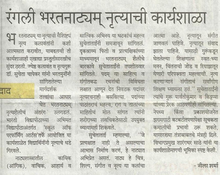 Dr. Sucheta Chapekar, a well known Bharatnatyam exponent and Guru expressed valuable and deep thoughts on ‘Abhinay and Aesthetics’ in a workshop held in School of Performing Arts. She underlined the importance of Aangik, Vachik, Aaharya and Satvik Abhinay mentioned in Natyashastra. She brought forth the intricacies and subtleties of Bharatnatyam in detail through audio visual presentation. Suchetatai taught one Abhinay composition to students in this workshop.