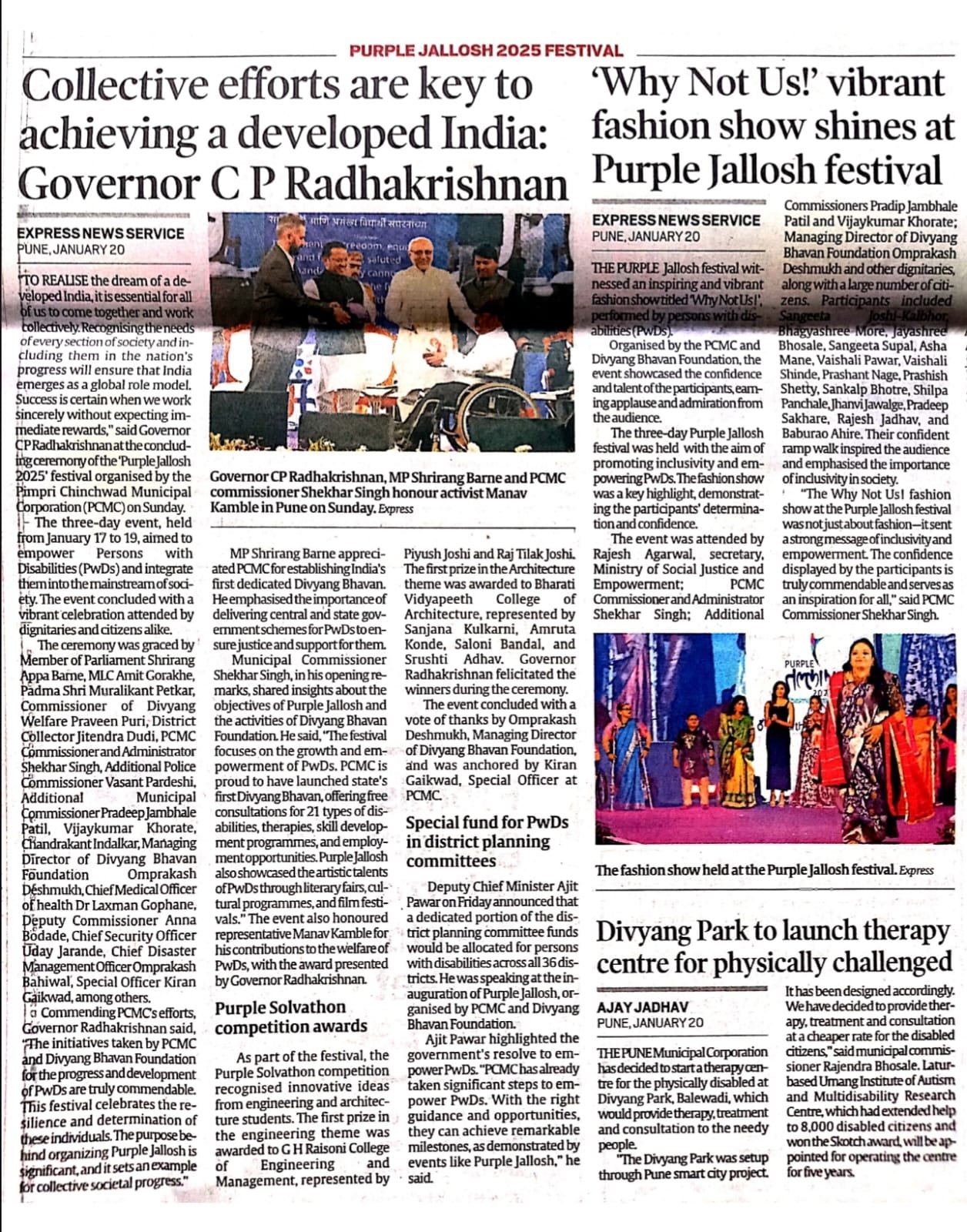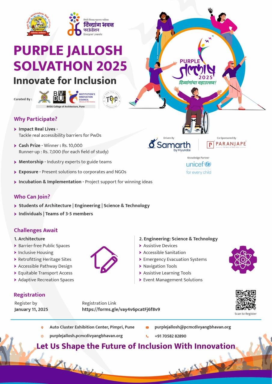 PCMC and Divyang Bhavan Foundation organized the State's largest event on Disability Inclusion called the PURPLE JALLOSH 2025 from 17 th to 19 th Jan 25 at the AutoCluster Exhibition Centre, Pimpri. BVDUCOA was a proud knowledge partner for this event.