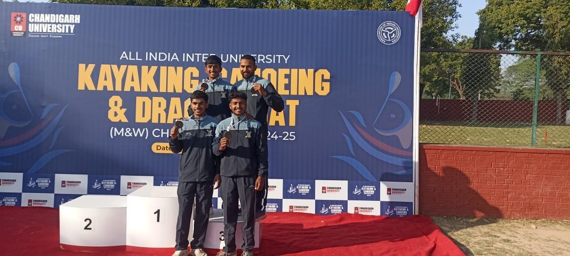 All India Inter University Kayaking, Canoeing, and Dragon Boat Competition (Men & Women) Championship 2024-25 is being organized by Chandigarh University from 11th to 17th March 2025 at Sukhna Lake in Chandigarh. Bharati Vidyapeeth (Deemed to be University), Pune team won a bronze medal in Canoeing (Boating) event on 12th March 2025. The team comprised of four players. Out of these, 3 players Sahil Makandar, Niranjan Patil and Parth Kadam are of IMRDA, Sangli. Director Dr. Pallavi Jamsandekar and Vice Principal Dr. Pratap Desai the students and institute’s sports director Mr. Yogesh Patil on the success.