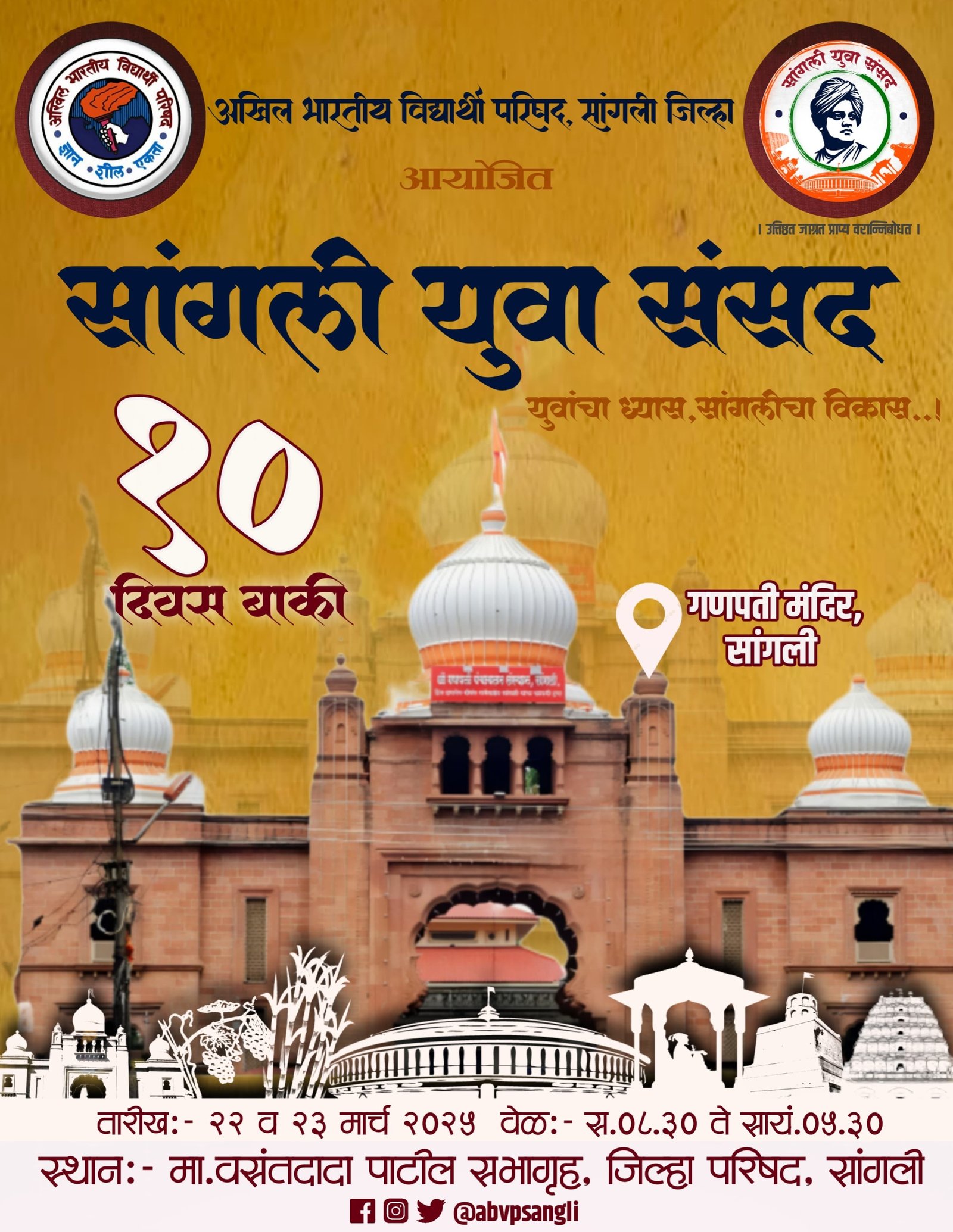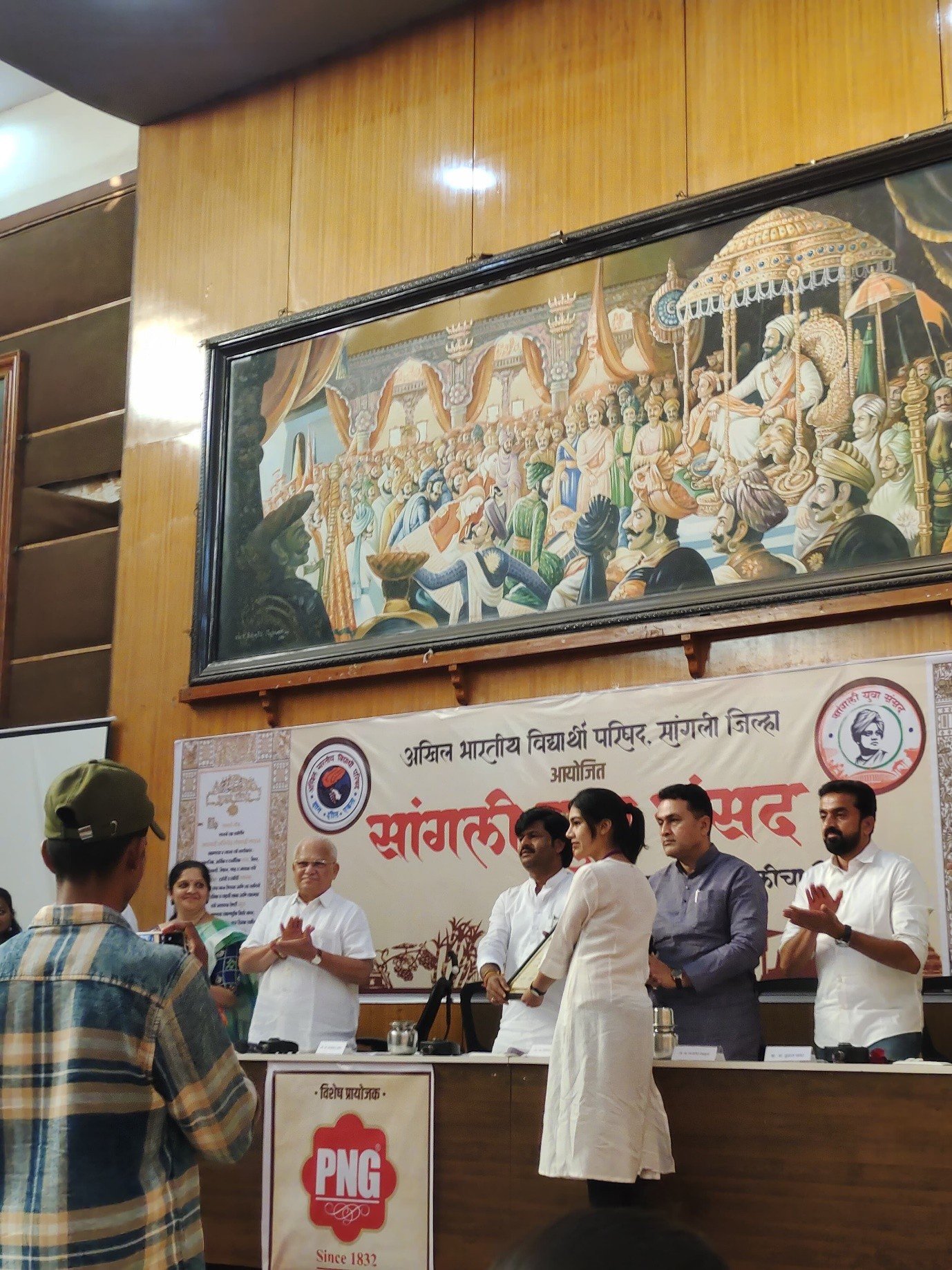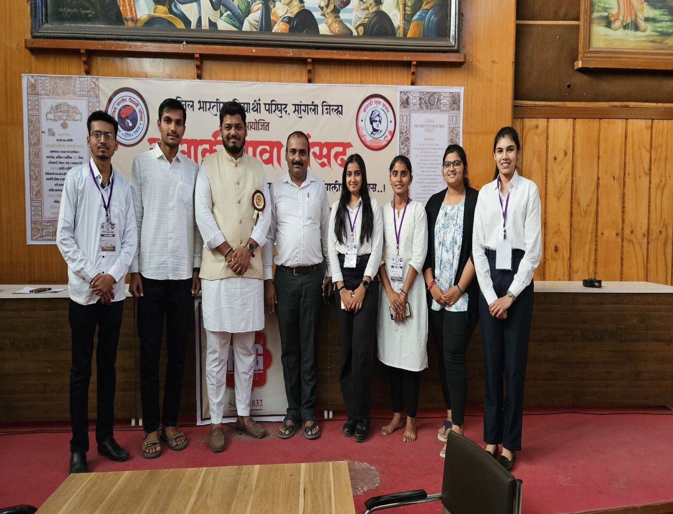 Institute’s team participated in Sangli Youth Parliament organized by Akhil Bharatiya Vidyarthi Parishad, Sangli District. The event was held on 22nd & 23rd March 2025 at Vasantdada Patil Auditorium, Zilla Parishad, Sangli. More than 100 students from various education institutes were present for the event. Teams present for the event were divided into ruling party members and opposition party members for discussing issues regarding development of Sangli. The institute team got to play opposition party members and contributed valuable insights and suggestions on the subject. Team comprised of MBA first year students Sakshi Jakhotiya, Shivam Malkar, Sumit Shah, Akansha Gaikwad and BBA second year students Pankti Gangar and Sakshi Mohite. Institute’s MBA first year student Siddhi Jakhotiya was honored with the award "Sangli Yuva Sansad Ratna" (1st Prize) for outstanding contribution on both days. She received the award at the hands of Mr. Gopichand Padalkar, Hon. member of the Legislative Assembly (MLA) Jat and in the presence of Mr. Sudhir Gadgil, Hon. member of the Legislative Assembly Sangli and Mr. Satyajit Deshmukh, Hon. member of the Legislative Assembly, Shirala.