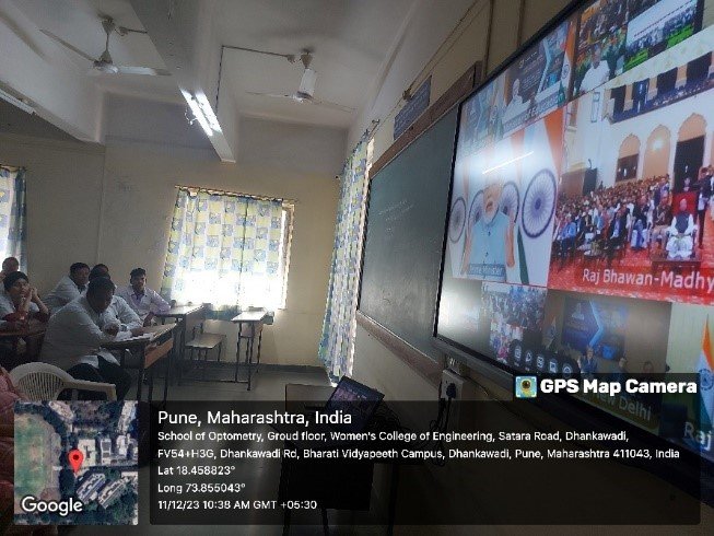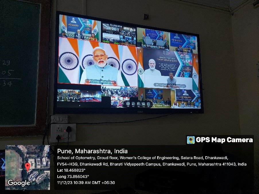 All the undergraduate and postgraduate students, teaching and Non-teaching faculty of BV(DU), School of Optometry, Pune watched the telecast of launching of Viksit Bharati@2047- Voice of Youth on Monday 11th December 2023 through virtual mode. Honorable Prime Minister addressed the audience, highlighted about the role of faculty and educational institutes, and that nation can develop by the development of its people, also informed about the launch of Ideas Portal related to Viksit Bharat and informed that suggestions can be given on 5 different themes. The vision of the scheme comprises to make India a developed nation by 2047, the 100th year of independence and considers various aspects of development, including economic growth, social progress, environmental sustainability, and good governance.