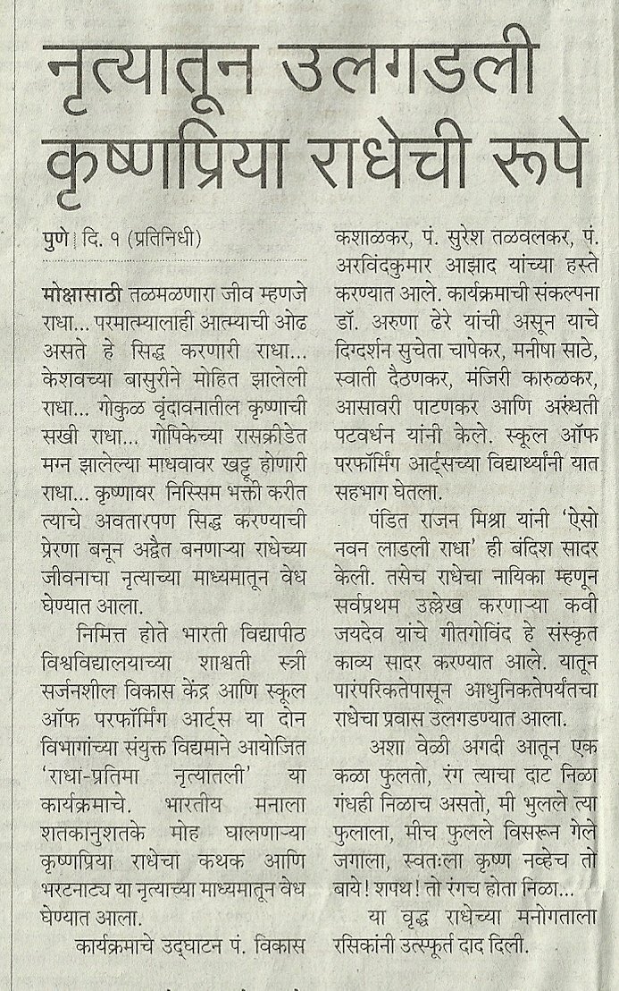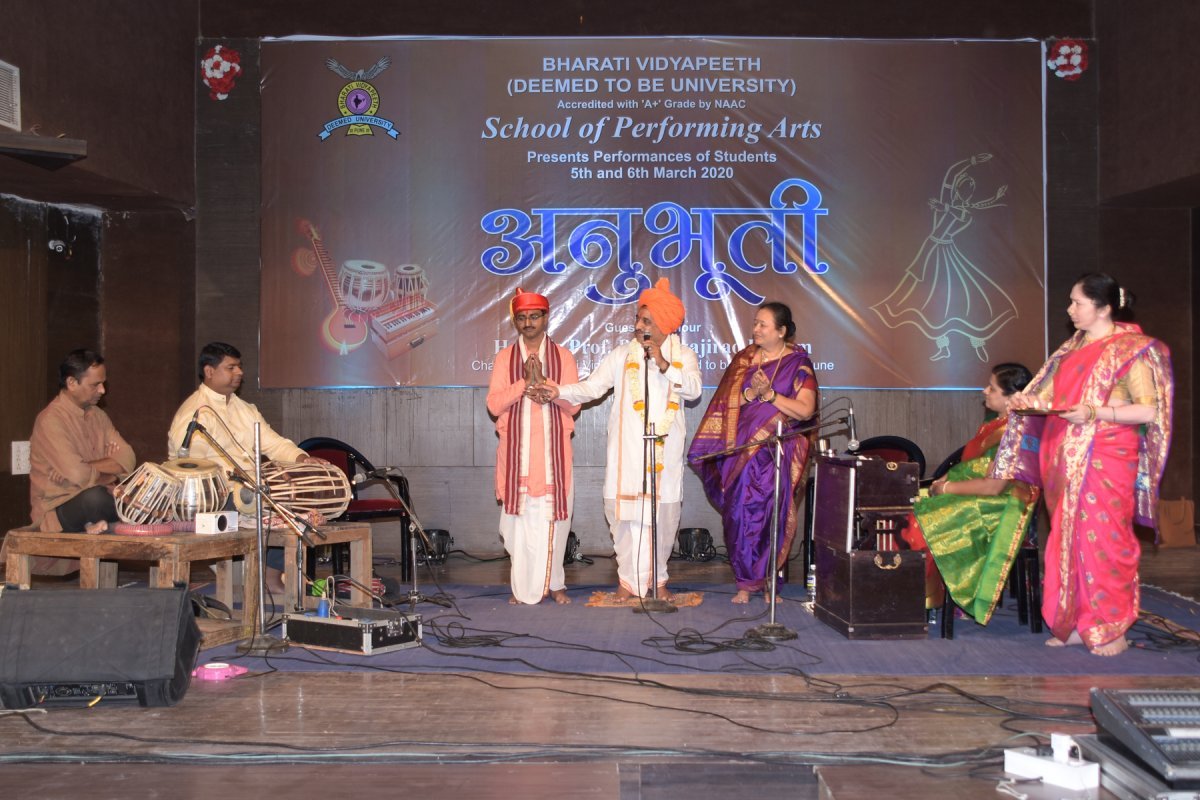 Anubhooti’ an important yearly program, was organized this year for three days. On 1st day presentations of Varakari and Naradiya Kirtan by our Kirtan students created very devotional environment. On 2nd day our Music students presented their art, also various Choreographies were presented by our Dance students. On 3rd day ‘Jawali’ a unique concept in Bharatnatyam dance style was presented by renowned Bharatnatyam dancer and respected Guru in School of Performing Arts Dr. Swati Daithankar. All the performances were highly appreciated by the audience.
