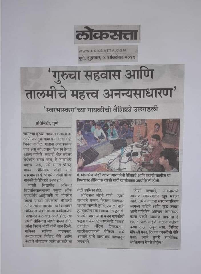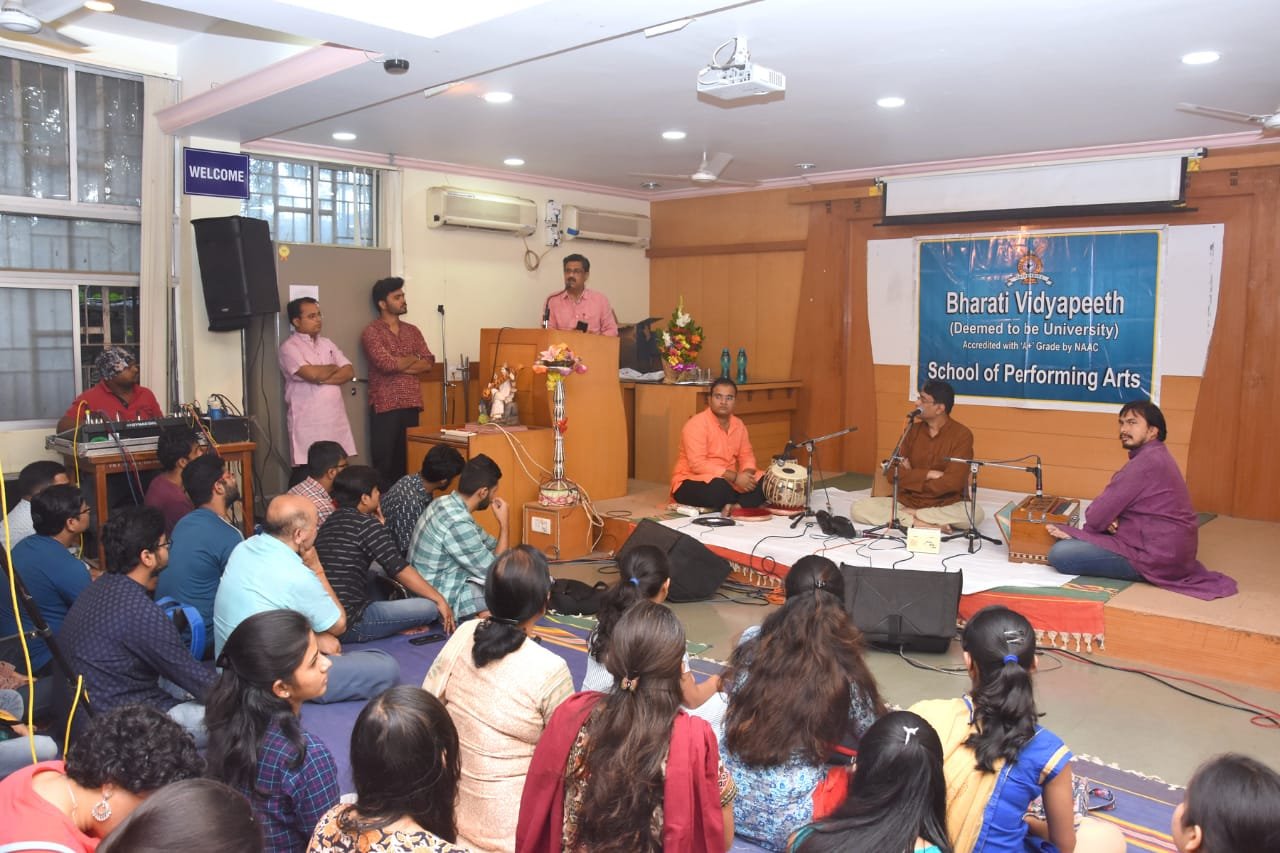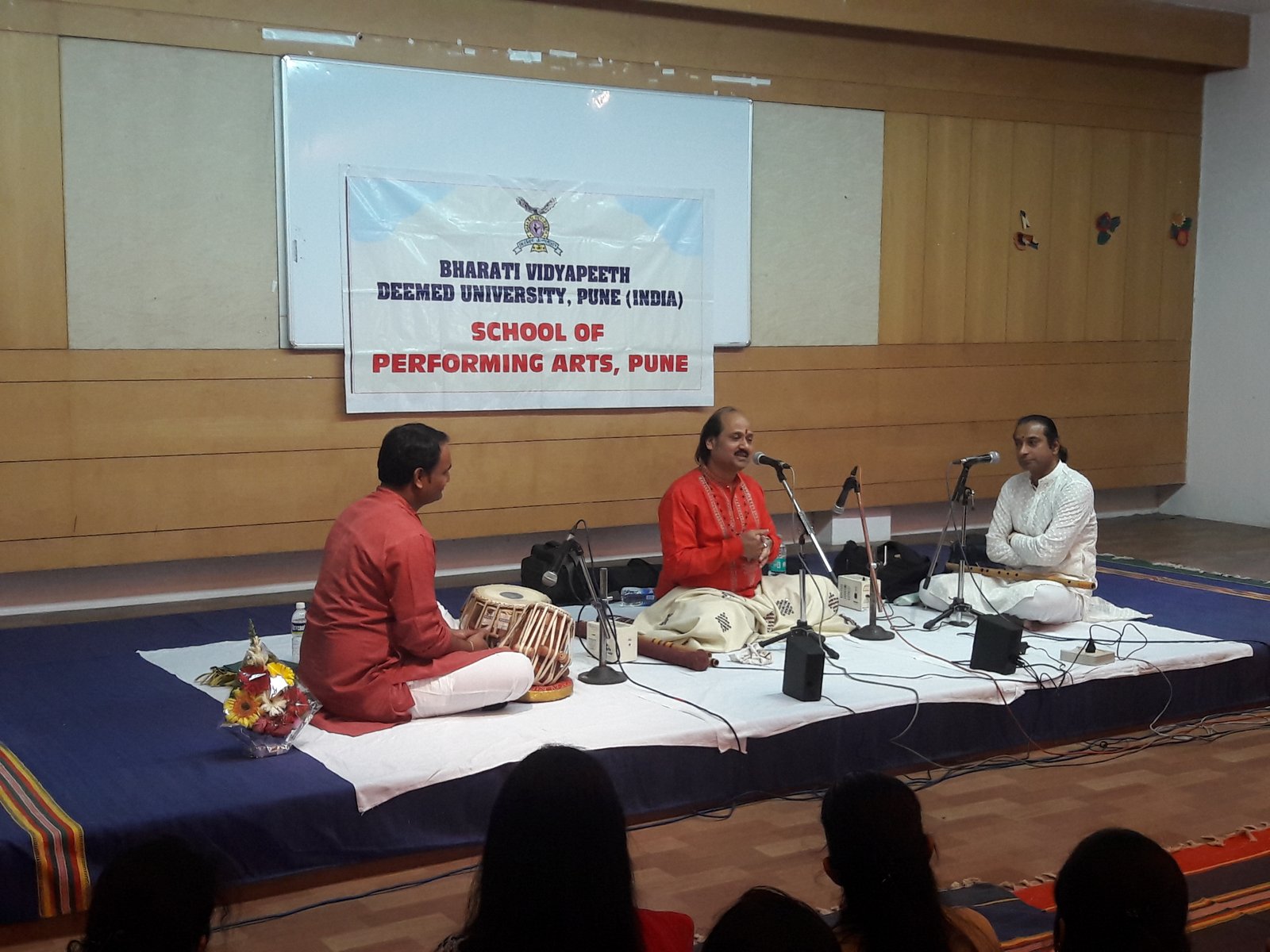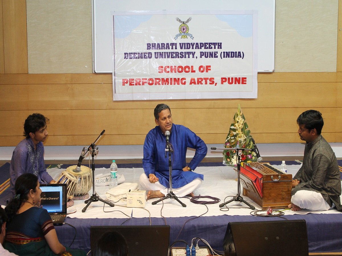 School of Performing Arts had organized workshop of Pt. Shrinivas Joshi featuring Aesthetical elements of Kirana Gharana and the Gayaki of Bharatratna Pt. Bhimsen Joshi. Pt. Shrinivas Joshi spoke on Swara Lagav, Raga elaboration technique of Kirana Gharana. He also discussed in detail about the presentation of Thumari in Kirana Gharana and other related topics. Later he talked at length about Gayaki of his father Late Pt. Bhimsen Joshi and his Riyaz techniques. Students also learned some special compositions of Kirana Gharana.
